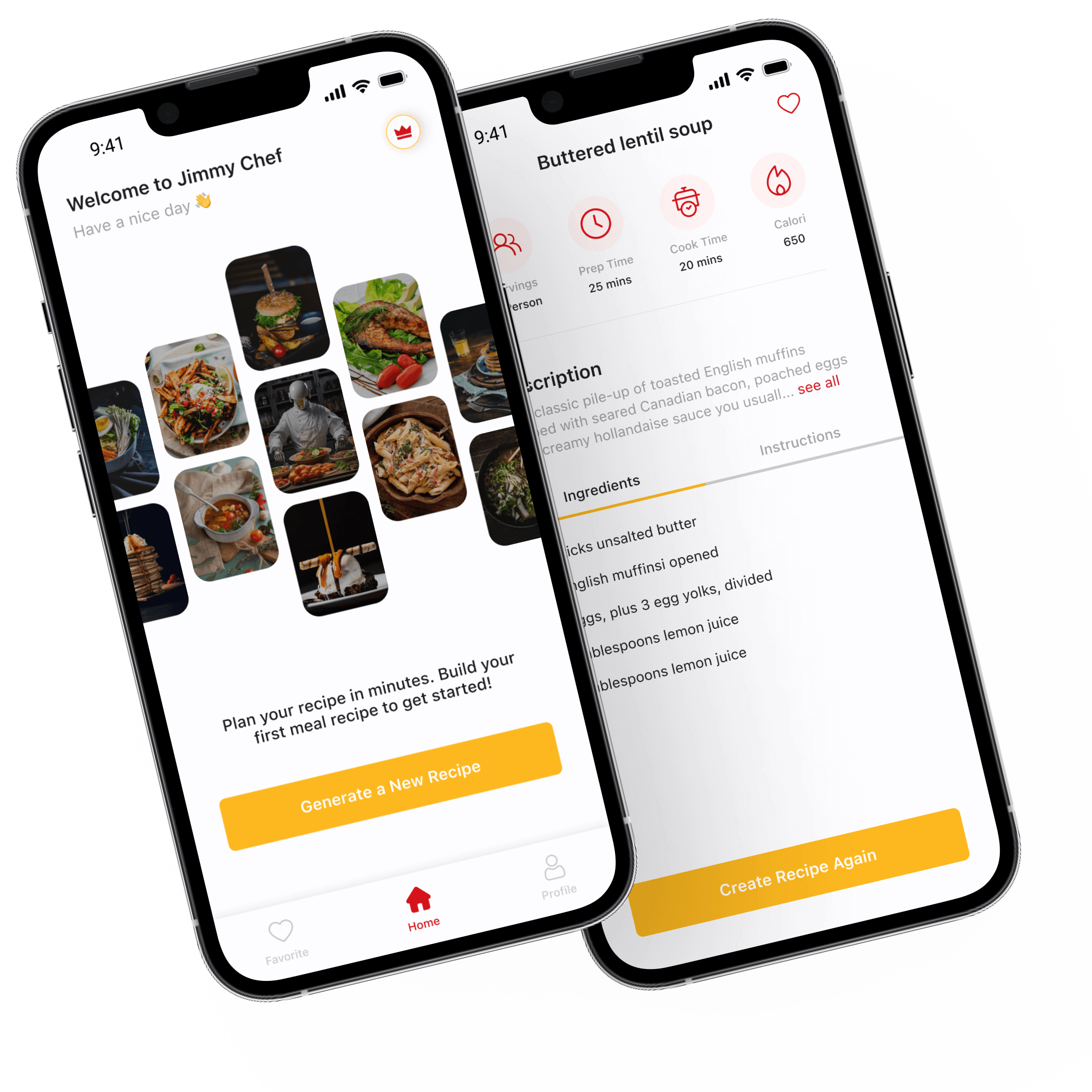 Simply input your preferences, and let Jimmy Chef do the rest. Within seconds, you'll have a personalized AI-generated recipe that are not only delicious but also perfectly suited to your tastes.